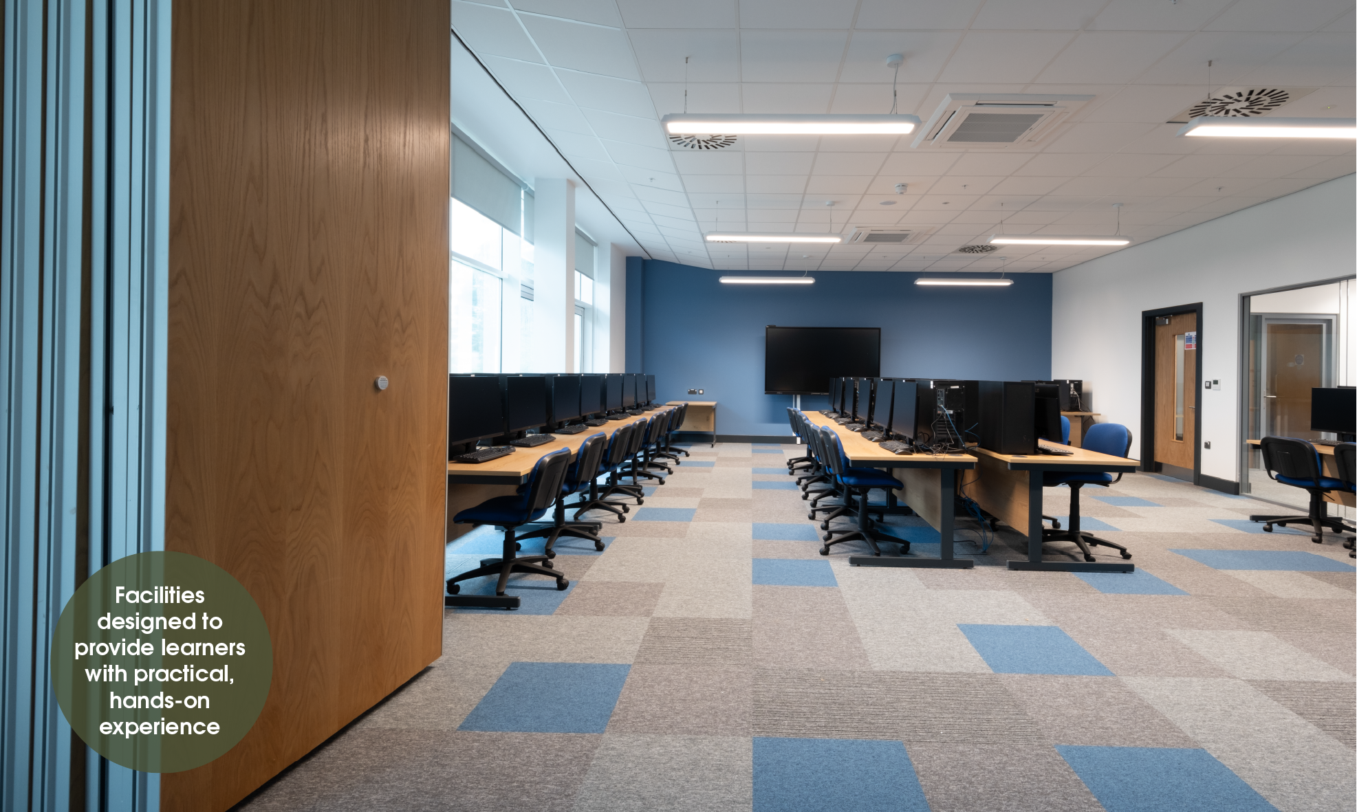 This brand new campus includes cutting edge facilities from I.T suites, teaching spaces, and an ultra-modern library plus space and modern social and dining areas. Hair, beauty and nail salons are also open to the public, as well as a 180 seat performance studio, utilised by the Performing Arts department.