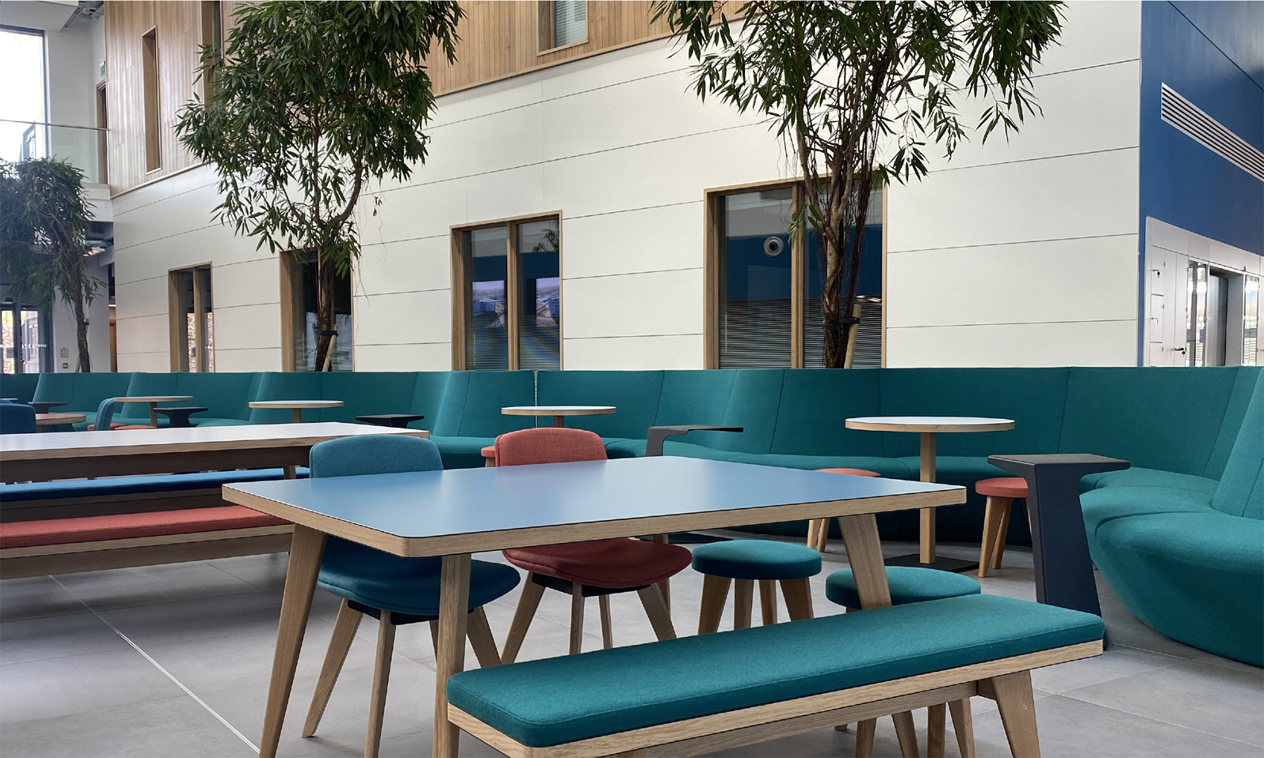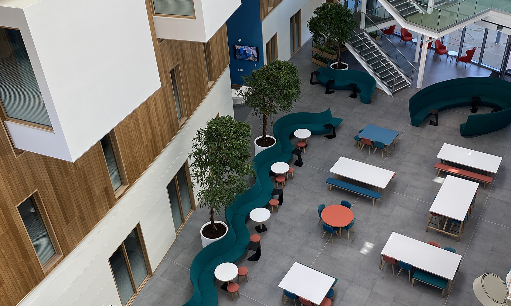 Our clients wanted a professional, high end teaching facility while emphasising the organisation values. The results we delivered - an incredible space that uniquely features the brands vision while configured for success! At the heart of the design is well-being and comfort - the flexible meeting and agile spaces further add the important biophilic design elements, check out the relaxing river like Atom sofa with addition of trees in the Atrium.