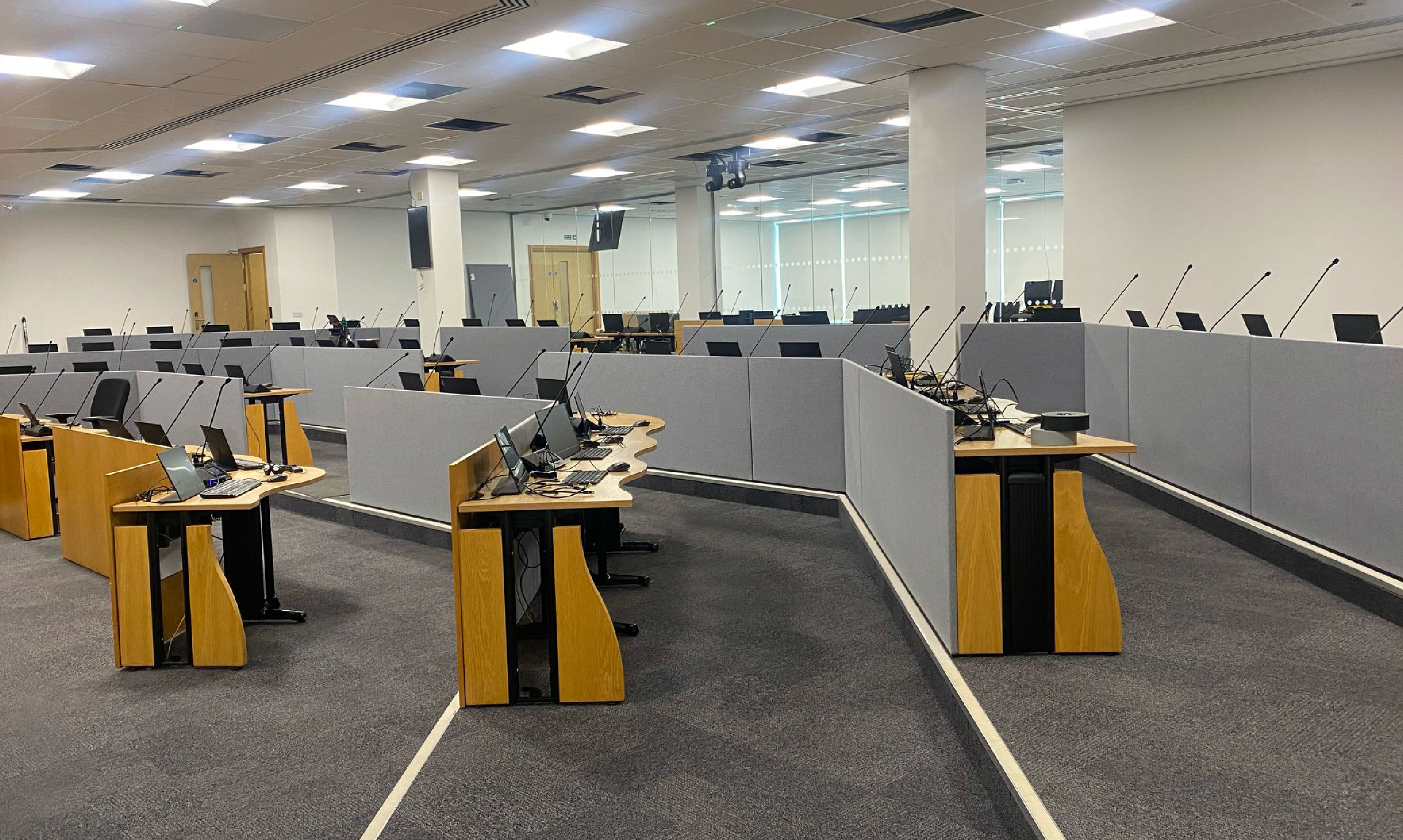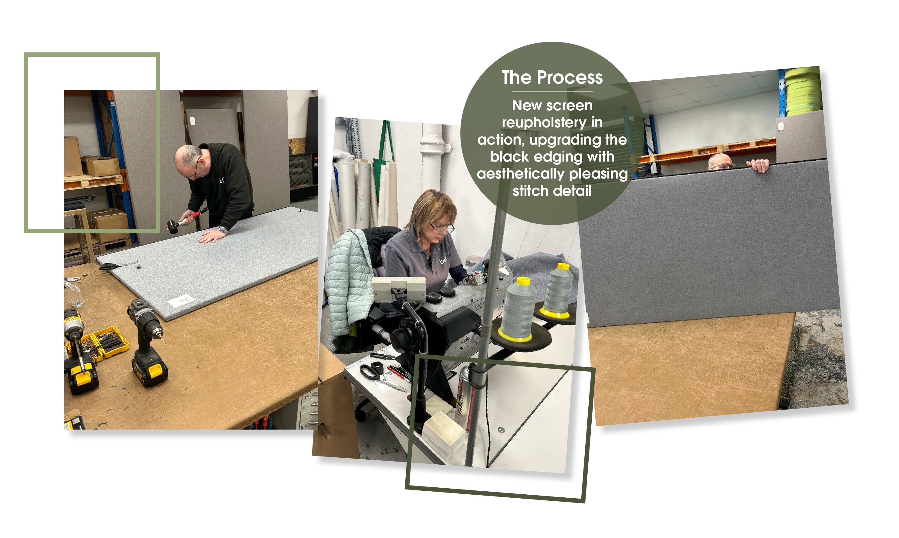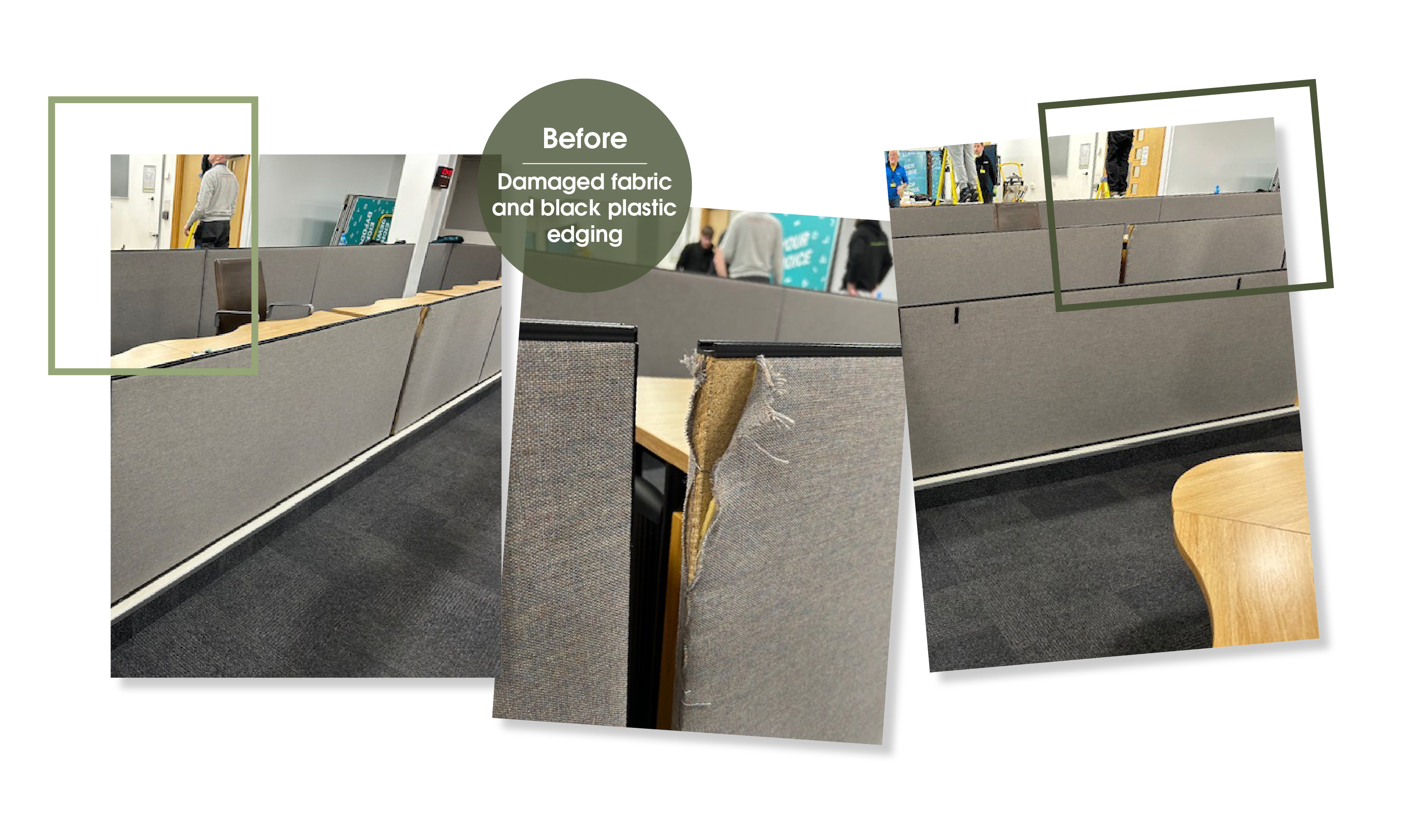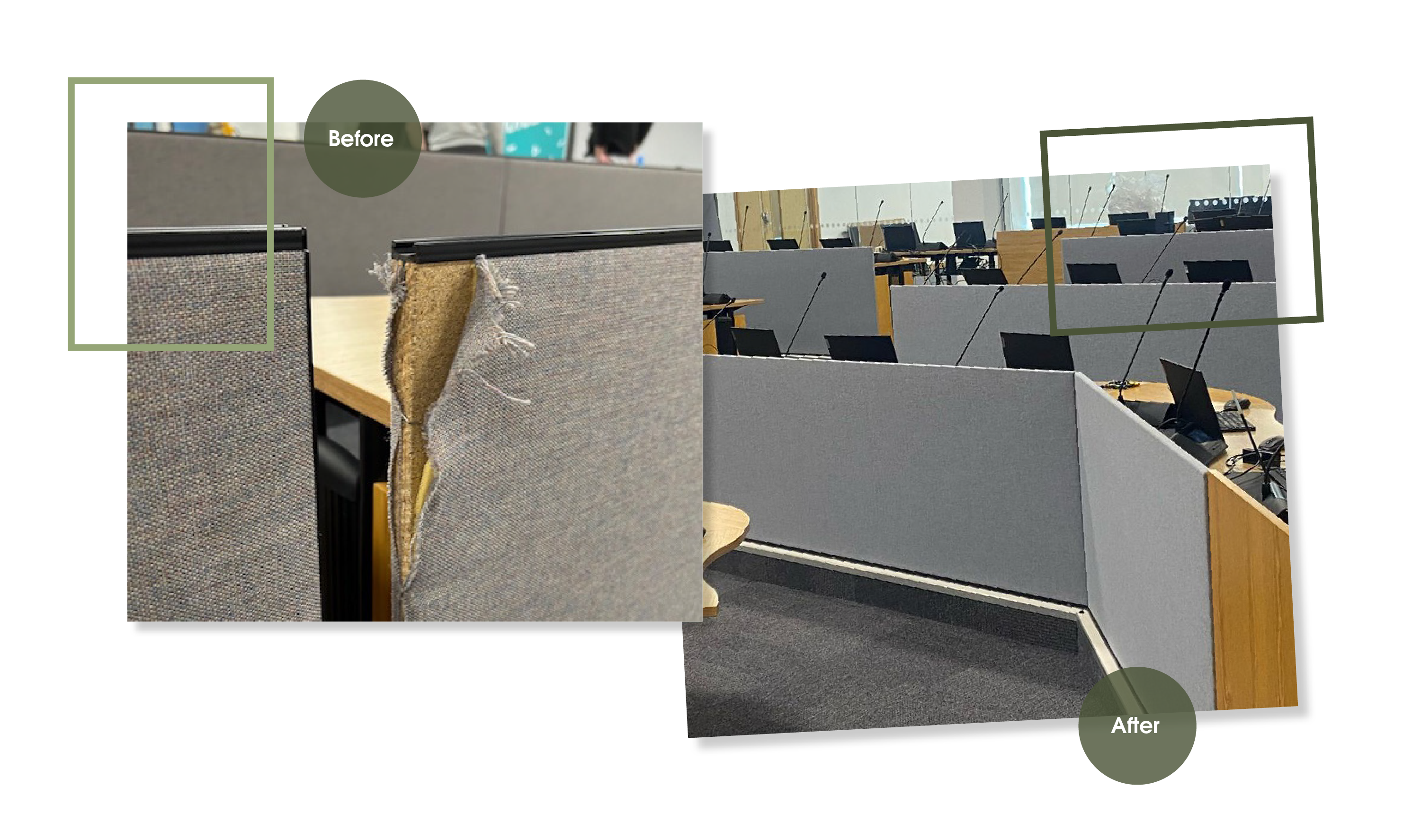 Senedd Cymru | Welsh Parliament, Tŷ Hywel saved 27 acoustic screens from disposal by using our eco-friendly refurbishment process. Following a site survey and assessment our professional team reupholstered the screens, replacing the damaged plastic edge with an aesthetically pleasing stitch detail - championing sustainable practices by prolonging the life of workspace product and showcasing our in-house circular furniture services.