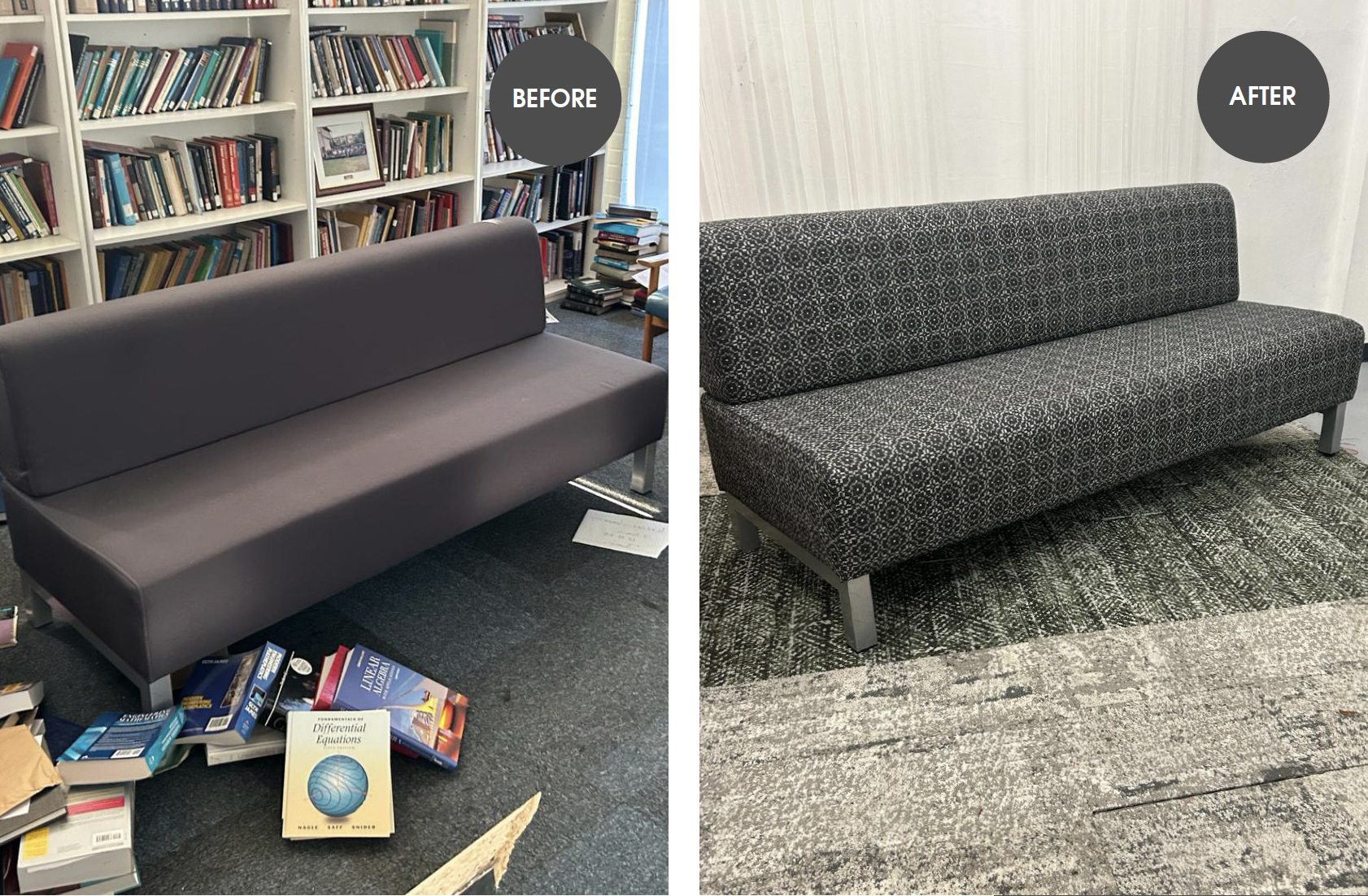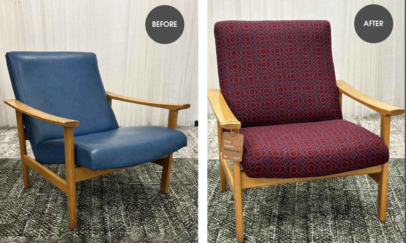 We were delighted to be appointed for this seating refurbishment project for Y Lle a collaborative workspace for Cardiff University’s Welsh-speaking community - of all levels of ability. The project showcases our in-house ‘Circular Furniture Services.’ Cardiff was enthusiastic throughout the process, as well as reducing their carbon impact supporting the local economy was high on their agenda. All components were sourced within a 6 mile radius and 100% wool fabric was selected from Melin Tregwynt, a manufacturer since 1841, employing over 40 local people - inspired by Welsh tradition.