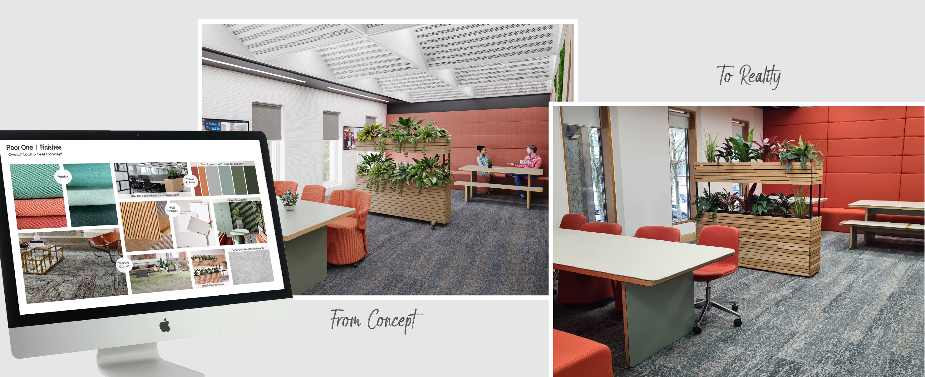 Throughout the design process, our team provides a comprehensive documents to help you clearly visualise your new space. Whether it’s selecting colour palettes, sustainable fabrics, or finishes, we offer interior design solutions that seamlessly blend aesthetics, functionality, and brand identity - ensuring every element aligns with your vision, green strategies and the functionality of the space.